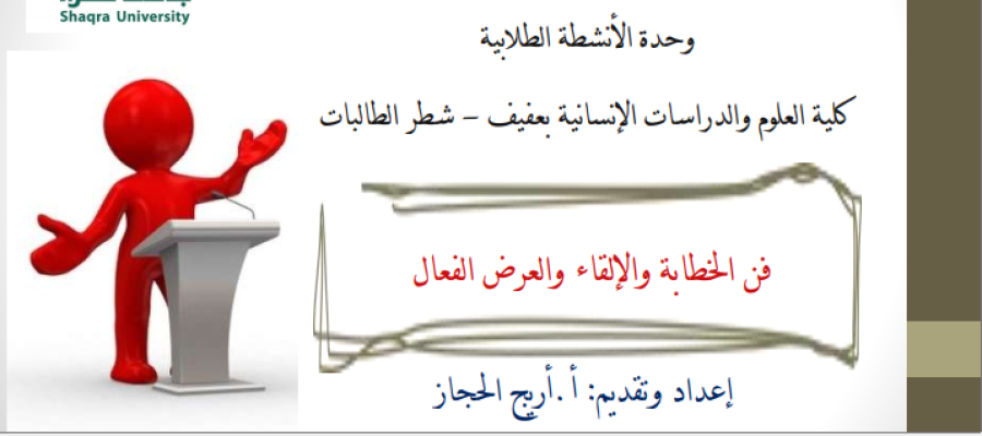 كما تم توضيح صفات الخطيب الناجح.والتعرف على سر الإلقاء الجيد.