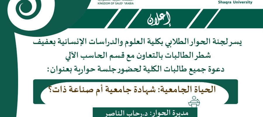 برعاية سعادة عميد كلية العلوم والدراسات الإنسانية بعفيف شطر الطالبات د.محمد بن حوال العتيبي وبتوجيه وإشراف من سعادة وكيلة الكلية د. وجود المدني، قام قسم الحاسب الآلي بتفعيل جلسة حوار طلابي بعنوان : الحياة الجامعية: شهادة جامعية أم صناعة ذات؟ وذلك يوم الخميس الموافق 8/9/1444هـ في تمام الساعة 12 ظهرا إعداد وتقديم الدكتورة رحاب محمد الناصر، تناولت الجلسة الحوارية تعريف لمفهوم الحياة الجامعية وكيفية الاستفادة القصوى من سنوات الدراسة في اكتساب مهارات ومعارف وسلوكيات حميدة تأثر بشكل إيجابي في بناء شخصية واعية ومسؤولة ومؤهلة لمقابلة الحياة العملية والوظيفية كما ناقشن الطالبات السبل الممكنة للتطور الأكاديمي والمعرفي وذلك بالمشاركة والاستفادة من الدورات التي يتم طرحها من قبل الجامعة والكلية.