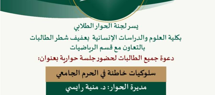 ضمن فعاليات لجنة الحوار الطلابي بكلية العلوم والدراسات الإنسانية للطالبات بعفيف وبالتعاون مع قسم الرياضيات بالكلية ــ وبتوجيه من سعادة عميد الكلية د. محمد بن حوال العتيبي وسعادة وكيلة الكلية د. وجود حسين المدني قامت اللجنة بتقديم محاضرة بعنوان :( سلوكيات خاطئة في الحرم الجامعي)، وذلك يوم الاثنين 25/10/1444 هـ في تمام الساعة التاسعة والنصف صباحاً اعداد وتقديم: طالبات الحوار الطلابي بقسم الرياضيات ، رئيسة الجلسة الحوارية الطالبة نوف نياف العتيبي