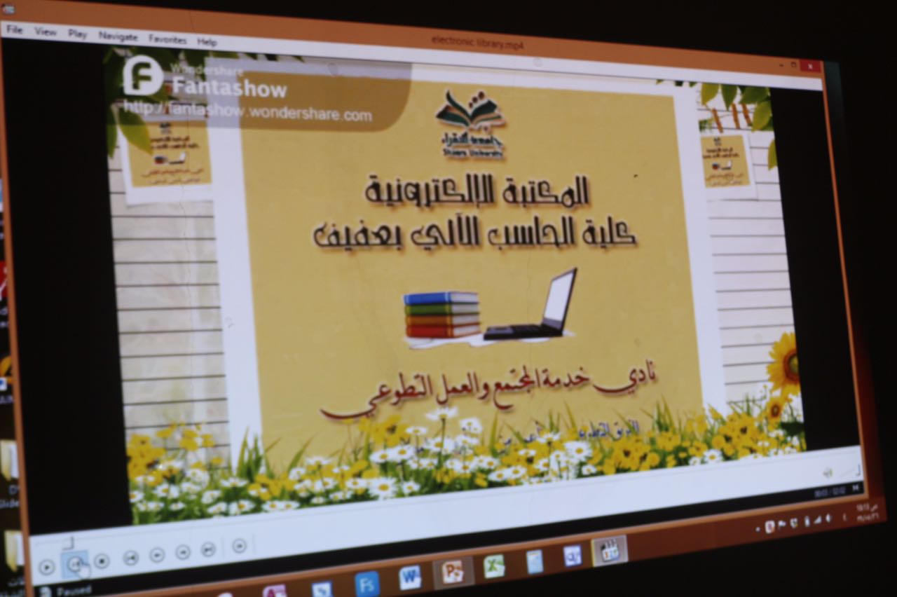 ضمن سلسلة الأعمال التطوعية لنادي خدمة المجتمع والعمل التطوعي ، قام الفريق التطوعي( أعمل من أجل جامعتي) بتدشين مكتبة الكترونية لخدمة طالبات كلية الحاسب بعفيف . وتم الافتتاح برعاية المشرفة على وكالة الكلية الأستاذة/ سارة منور المطيري وبإشراف منسقة الأنشطة الطلابية الأستاذة أريج حجاز. وذلك يوم الأحد الموافق 26/7/1438هـ