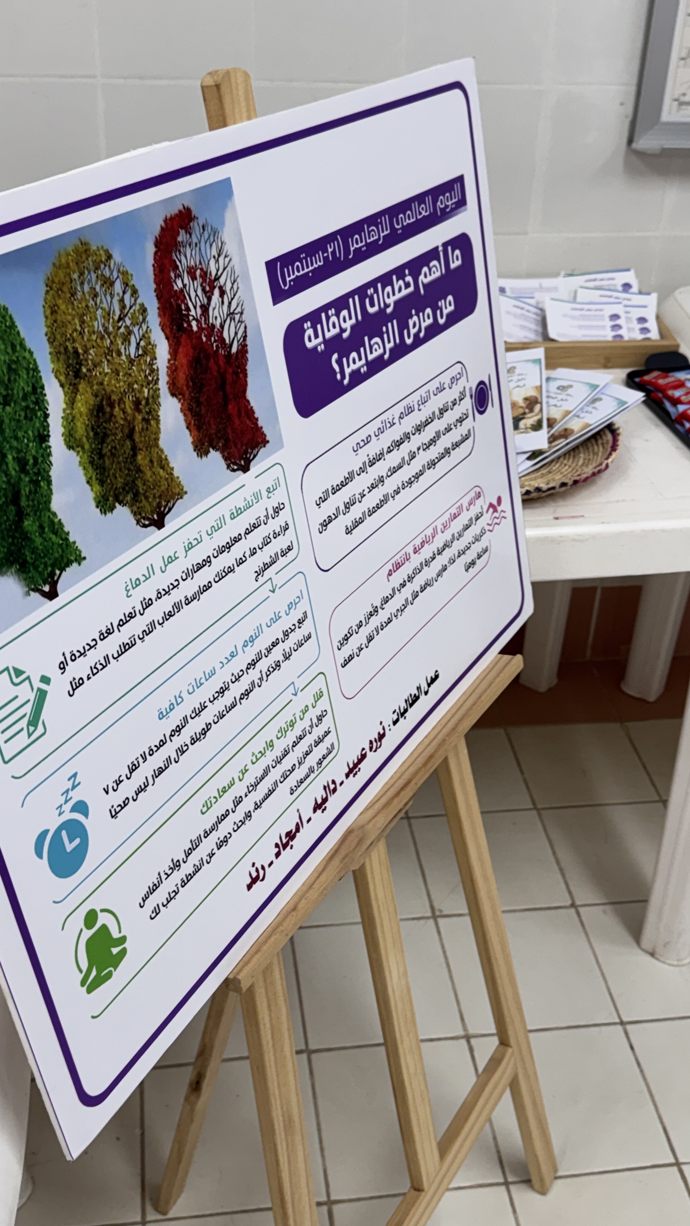 كذلك توعية الطالبات بكيفية التعامل مع المصاب باحترام وتعريفهن بإجراءات السلامة المنزلية، إضافة إلى إبراز أهمية نمط الحياة الصحي في تقليل مخاطر التدهور المعرفي.