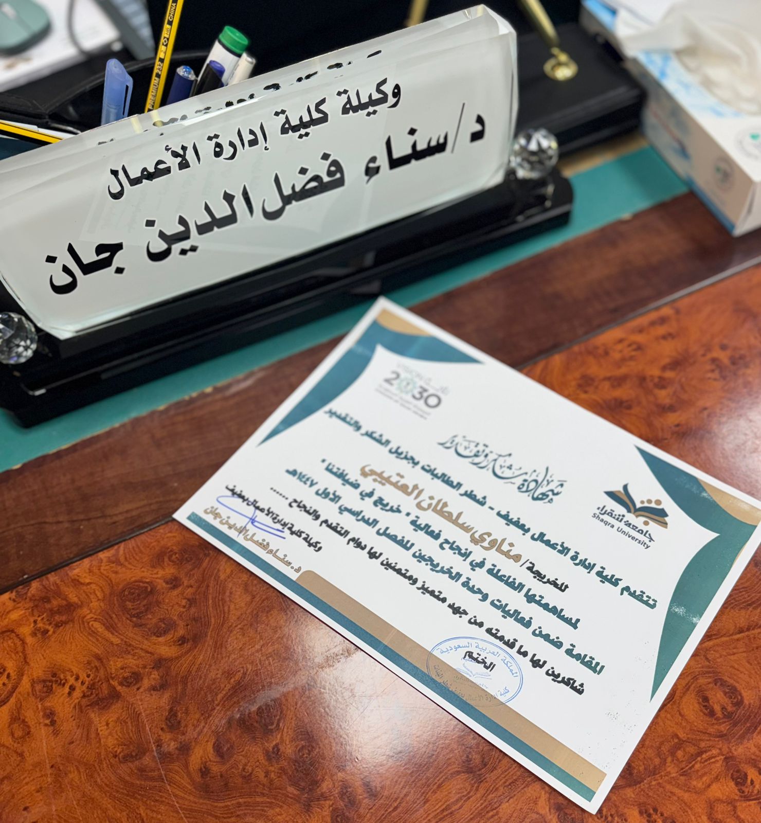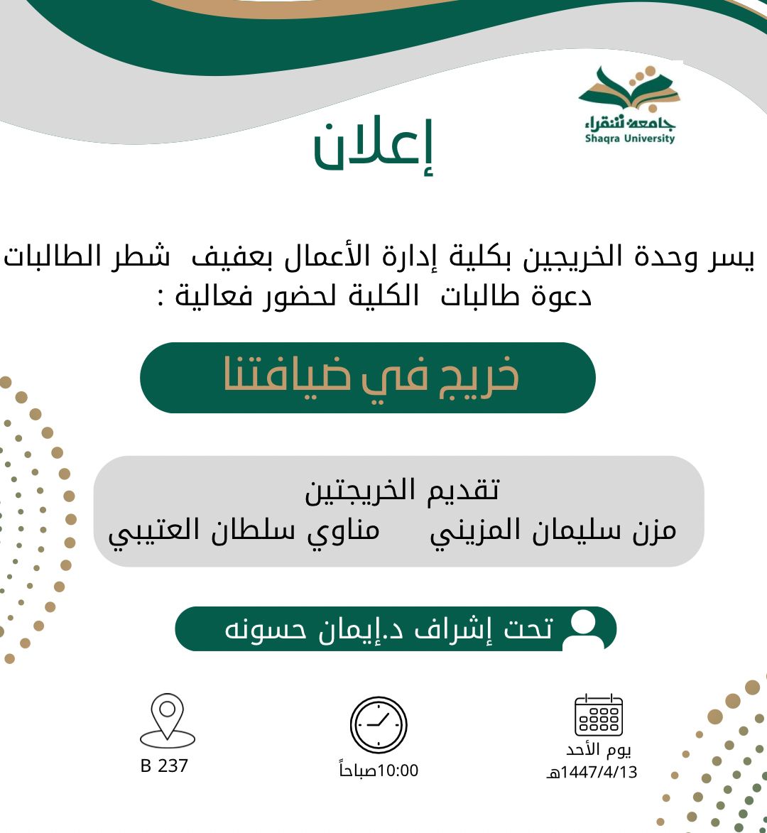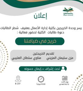 أقامت وحدة الخريجين بالكلية فعالية بعنوان خريج في ضيافتنا للطالبات المتوقع تخرجهن بالكلية، قدمتها الخريجتين مزن سليمان المزيني & مناوي سلطان العتيبي يوم الاحد الموافق13/4/ 1447هـ، وذلك بقاعة 237.