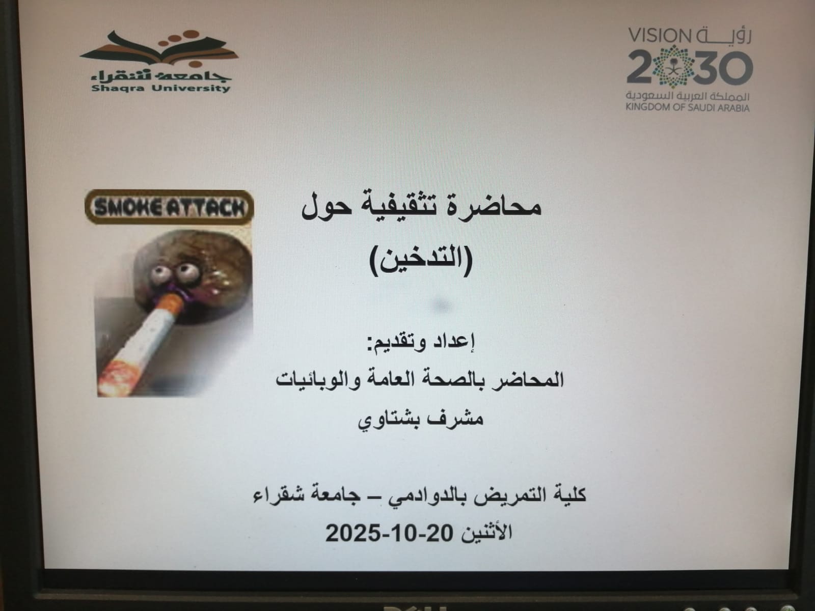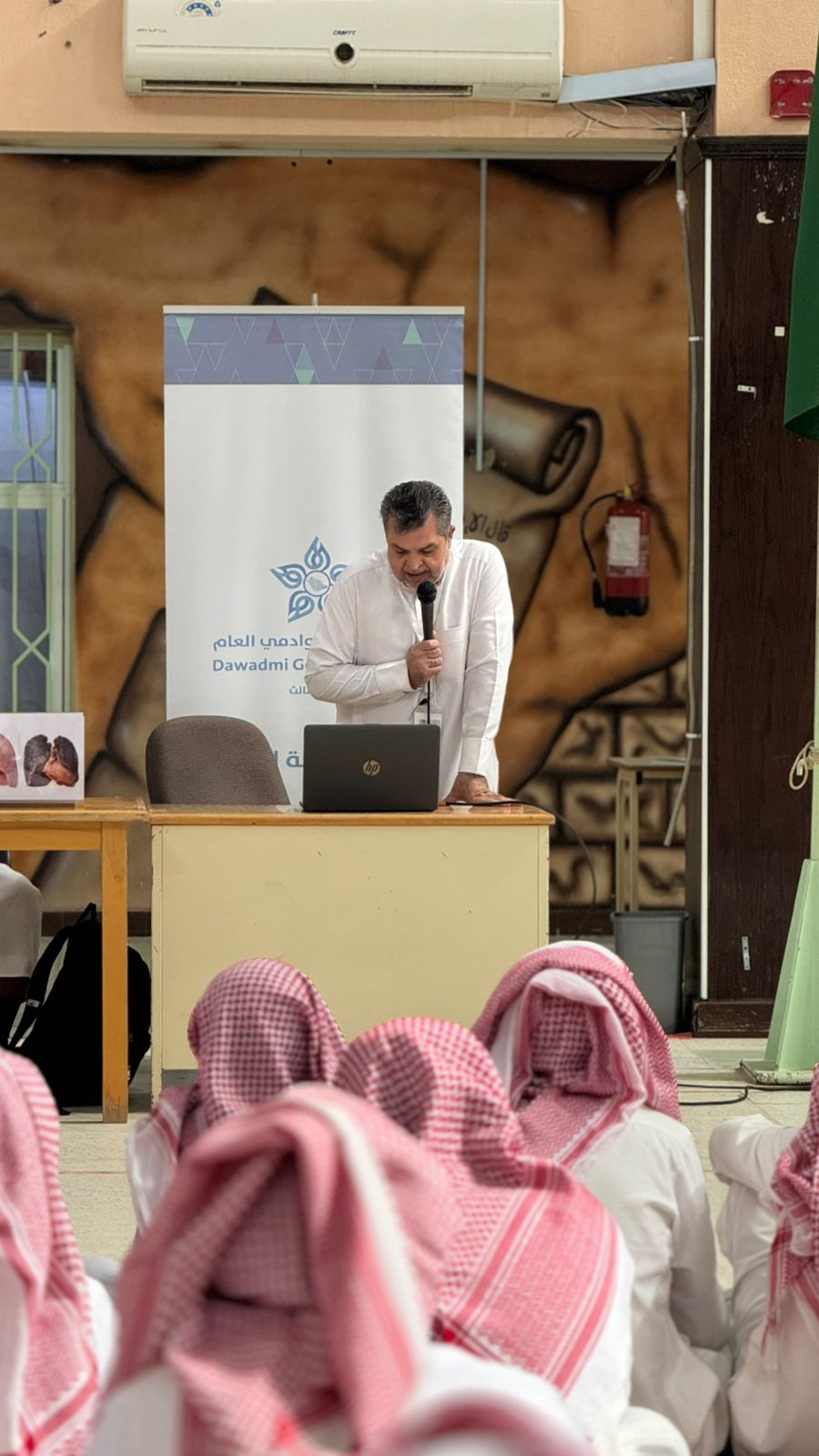 وذلك في يوم الأثنين الموافق 20 / 10 / 2025م لطلاب مدرسة ثانوية الدوادمي - تطوير من إعداد وتقديم المحاضر بالصحة العامة والوبائيات الأستاذ مشرف بشتاوي.