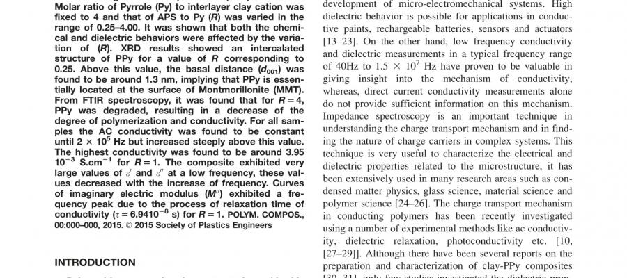 In this study, we report on the chemical and dielectric properties of polypyrrole (PPy) clay composite. The in situ polymerization has been carried out in an aqueous solution using ammonium persulfate (APS) as oxidant. Molar ratio of Pyrrole (Py) to interlayer clay cation was fixed to 4 and that of APS to Py (R) was varied in the range of 0.25–4.00. It was shown that both the chemical and dielectric behaviors were affected by the variation of (R). XRD results showed an intercalated structure of PPy for a value of R corresponding to 0.25. Above this value, the basal distance (d001) was found to be around 1.3 nm, implying that PPy is essentially located at the surface of Montmorillonite (MMT). From FTIR spectroscopy, it was found that for R = 4, PPy was degraded, resulting in a decrease of the degree of polymerization and conductivity. For all samples the AC conductivity was found to be constant until 2 × 105 Hz but increased steeply above this value. The highest conductivity was found to be around 3.95 10−3 S.cm−1 for R = 1. The composite exhibited very large values of ε′ and ε″ at a low frequency, these values decreased with the increase of frequency. Curves of imaginary electric modulus (M″) exhibited a frequency peak due to the process of relaxation time of conductivity (τ = 6.9410−8 s) for R = 1.