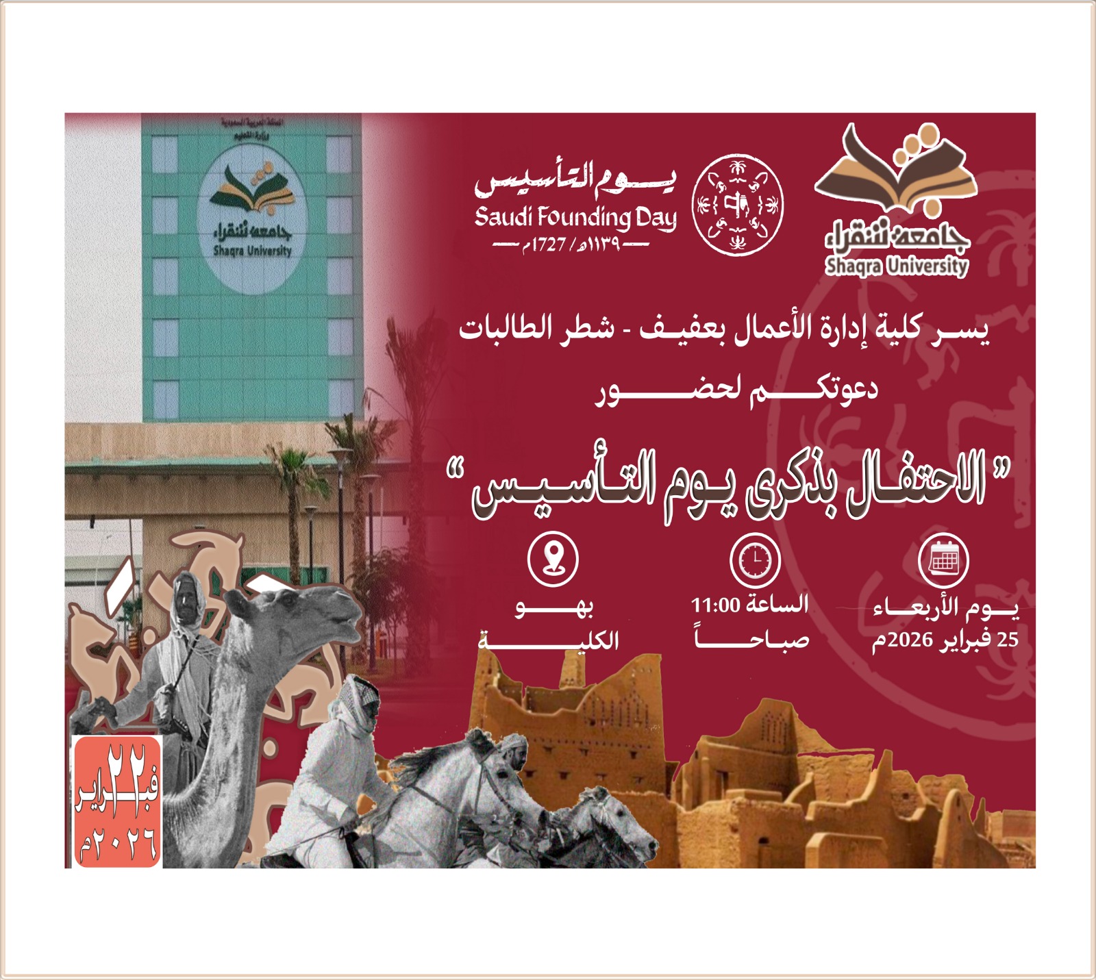 يوم الأربعاء الموافق 8/09/1447هـ الساعة 11:00 صباحاً ببهو الكلية