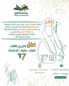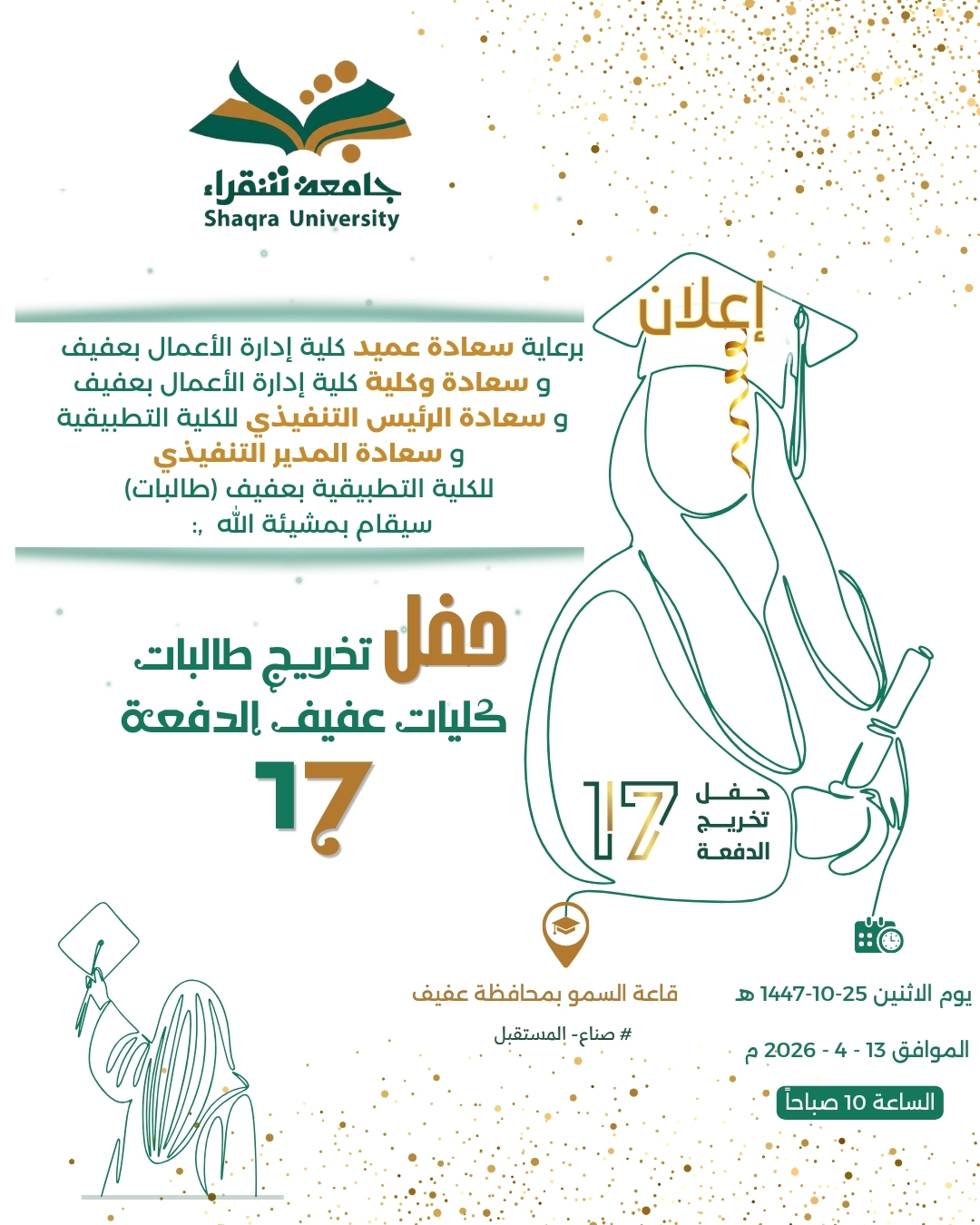 تقيم كليات محافظة عفيف حفل تخريج طالبات كليات عفيف الدفعة 17 للعام الجامعي 1447ه، وذلك يوم الإثنين 12الموافق /4/2026م الساعة 10:00 صباحا بقاعة السمو بمحافظة عفيف.