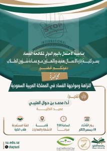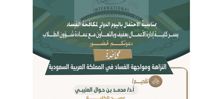 بمناسبة الاحتفال باليوم الدولي لمكافحة الفساد، تعلن كلية إدارة الأعمال بعفيف وبالتعاون مع عمادة شؤون الطلاب عن إقامة محاضرة بعنوان