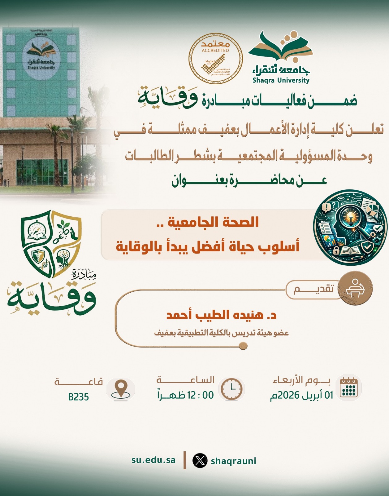 تعلن كلية إدارة الأعمال بعفيف ممثلة في وحدة المسئولية المجتمعية بشطر الطالبات، وفي إطار البرنامج التوعوي لمبادرة (وقاية)، محور الوقاية الصحية، عن إقامة محاضرة بعنوان "الصحة الجامعية .. أسلوب حياة أفضل يبدأ بالوقاية"، تقديم د. هنيده الطيب أحمد .. عضو هيئة تدريس بالكلية التطبيقية بعفيف، وذلك يوم الأربعاء الموافق 1 أبريل 2026م الساعة الثانية عشر ظهراً بقاعة B235.