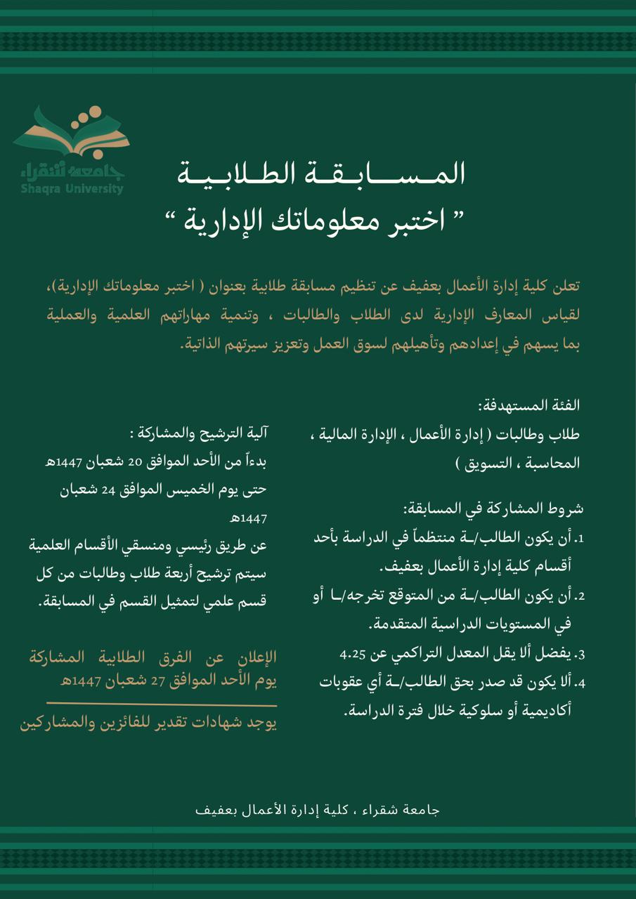 يسر كلية إدارة الأعمال بعفيف أن تعلن عن تنظيم مسابقة طلابية بعنوان: اختبر معلوماتك الإدارية وذلك لقياس المعارف الإدارية لدى الطلاب والطالبات، وتنمية مهاراتهم العلمية والعملية، بما يسهم في إعدادهم وتأهيلهم لسوق العمل، وتعزيز سيرتهم الذاتية.